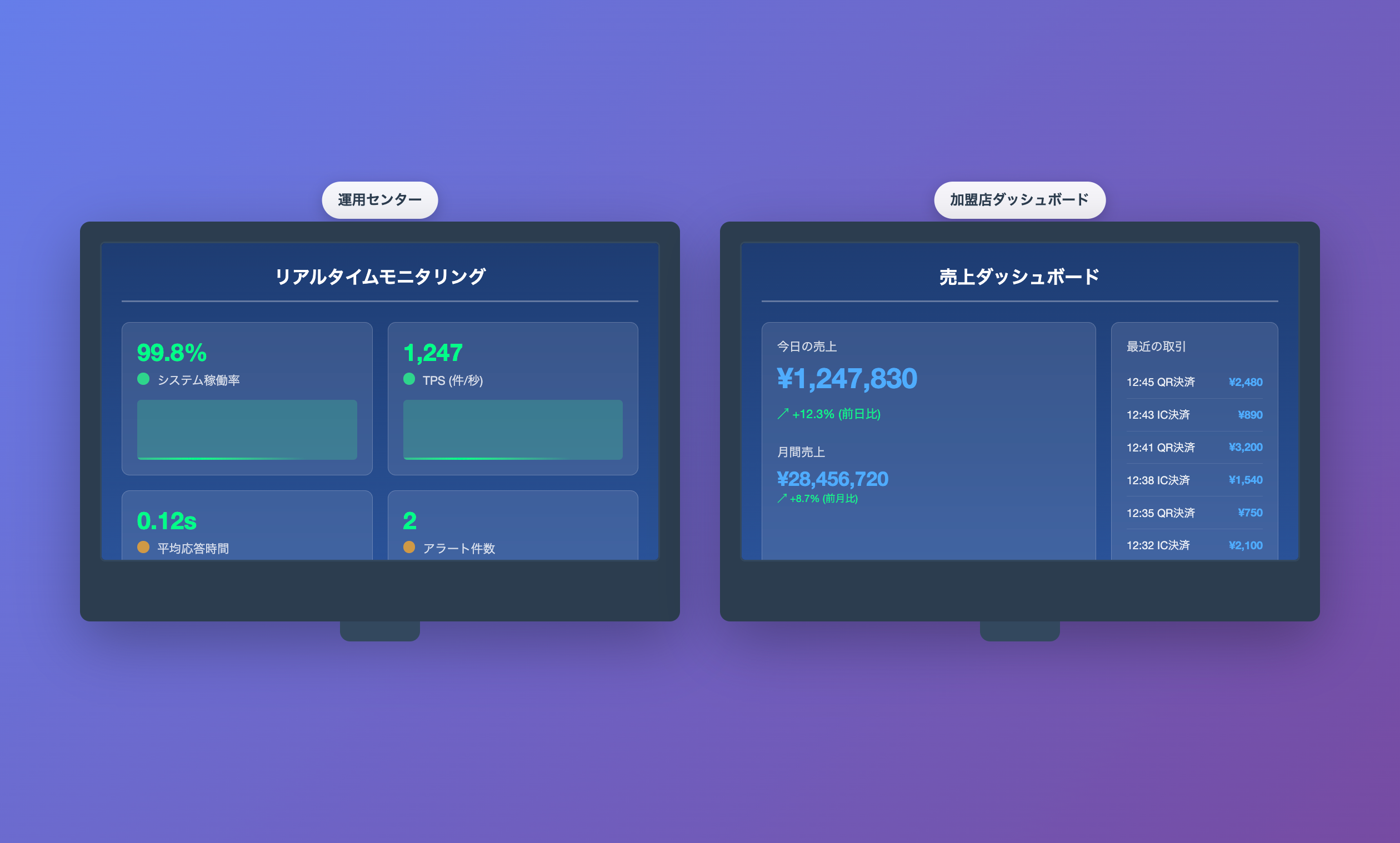 運用センターのモニタリング画面と加盟店向けダッシュボード 運用センターのモニタリング画面と加盟店向けダッシュボード