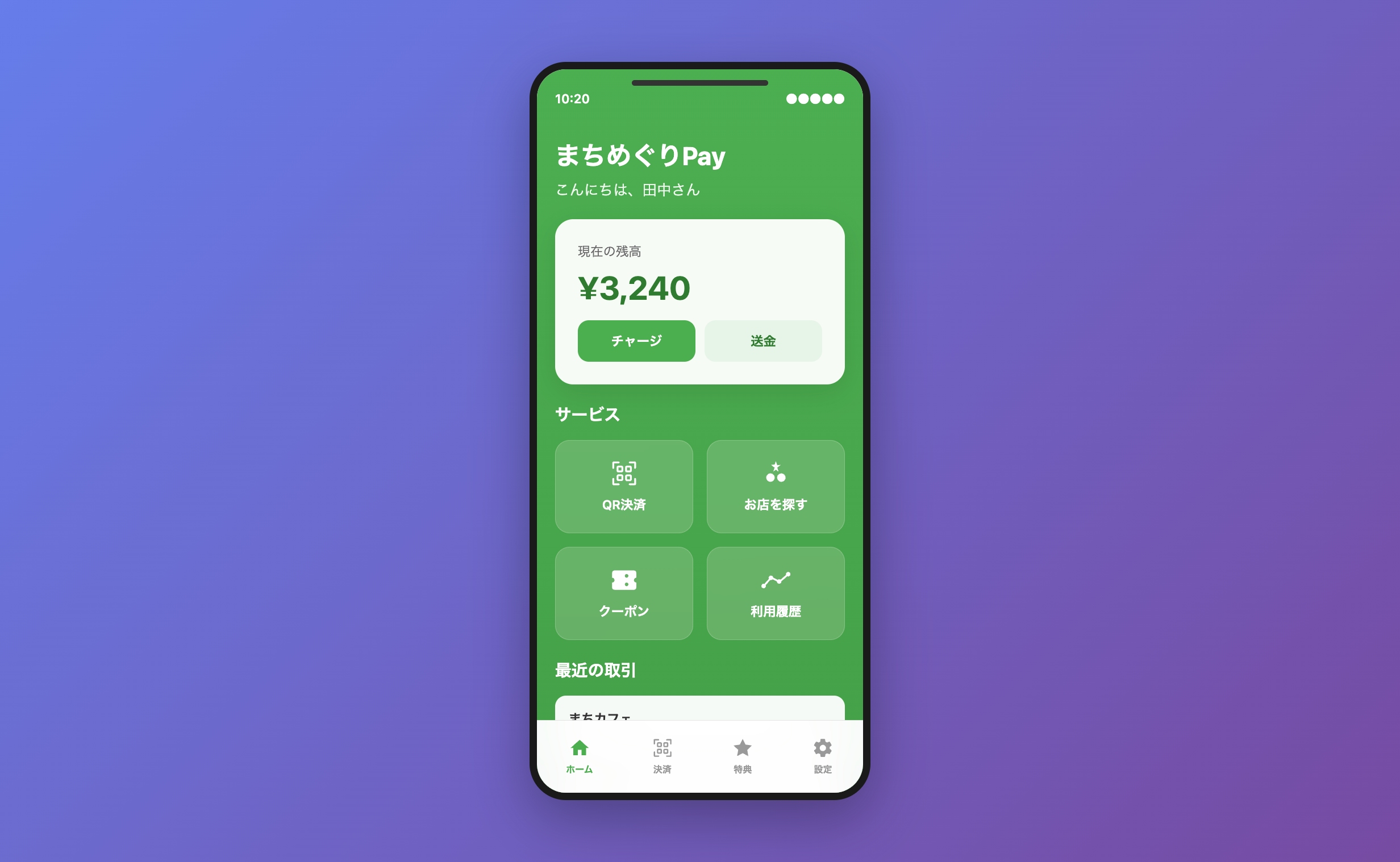 地域通貨アプリ「まちめぐりPay」のホーム画面 地域通貨アプリ「まちめぐりPay」のホーム画面